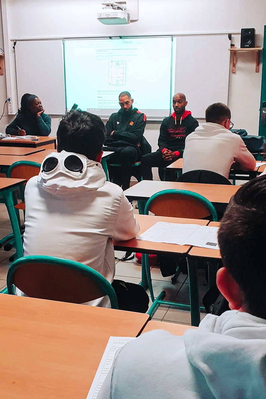 Le jeudi 30 janvier, Jazzmar Ferguson, Jaraun Kino Burrows et coach Alexandre Casimiri se sont rendus dans trois classes de terminales pour échanger en anglais avec les élèves du Lycée Henri Laurens de Saint-Vallier.
